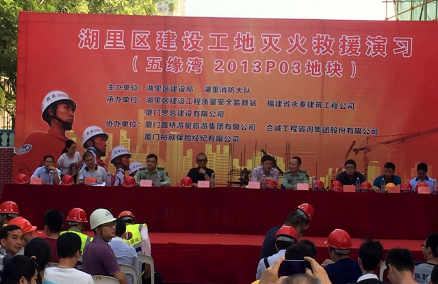 為增強(qiáng)建設(shè)行業(yè)消防安全意識(shí),提高建筑工地快速反應(yīng)和應(yīng)急處置能力,11月16日下午,由湖里區(qū)建設(shè)局、湖里消防大隊(duì)主辦,湖里區(qū)建設(shè)工程質(zhì)量安全監(jiān)督站、廈門思總建設(shè)有限公司、福建省永泰建筑工程公司承辦的湖里區(qū)建設(shè)工地滅火救援演習(xí)活動(dòng)在我司承建的五緣灣2013P03地塊項(xiàng)目開展。本次演練活動(dòng)共組織100余人參加,包括我司30名員工。