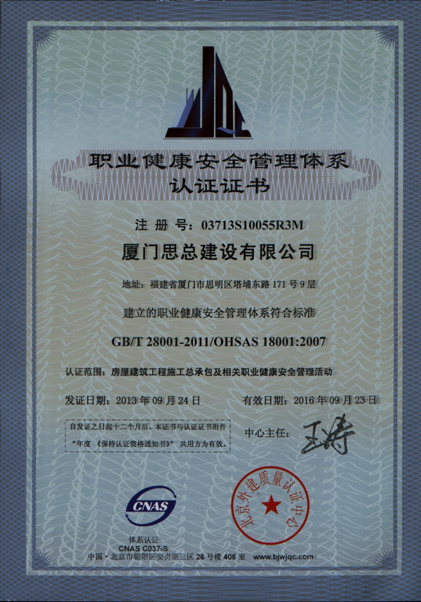 2013職業(yè)健康安全管理體系認(rèn)證證書